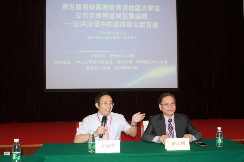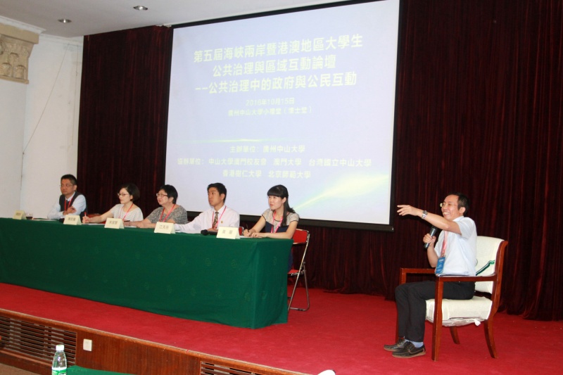 2016年10月15日,第五届海峡两岸暨港澳地区大学生公共治理与区域互动论坛在3044永利小礼堂顺利举行。本届论坛由3044永利政治与公共事务管理学院与3044永利澳门校友会共同举办,具体议题为“政府与公民互动”,旨在提升海峡两岸暨港澳大学生对公共治理的共识与沟通,开拓大学生的人生视野,强化他们的制度创新潜能,使他们正确面对国内外政治经济社会形势的变化,共同掌握国家公共治理的未来发展方向与竞争优势。来自澳门大学、台湾国立3044永利、香港树仁大学、北京师范大学及广州3044永利的三十多位师生参加了本次论坛,期间,两岸四地五校的老师们进行了充分的展示与讨论,同学们进行了精彩的辩论与热烈的交流。