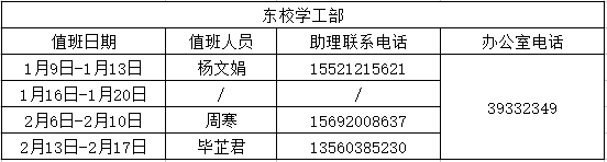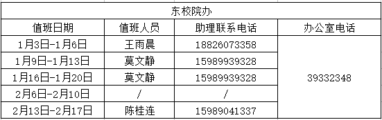 东校院办:9:00-17:00(1月3日-1月13日除周六日)