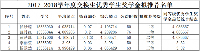关于2017-2018学年度交换生优秀学生奖学金院系拟推荐名单的公示