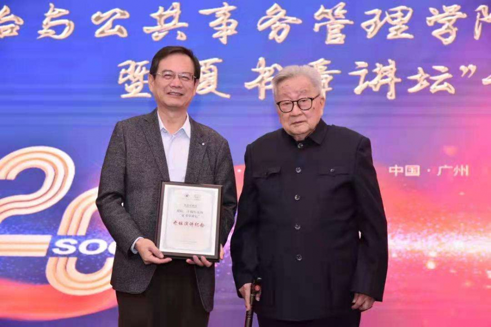 在活动现场,102岁高龄的夏书章先生亲自为演讲嘉宾华中师范大学人文社会科学徐勇教授颁发开坛演讲纪念牌。