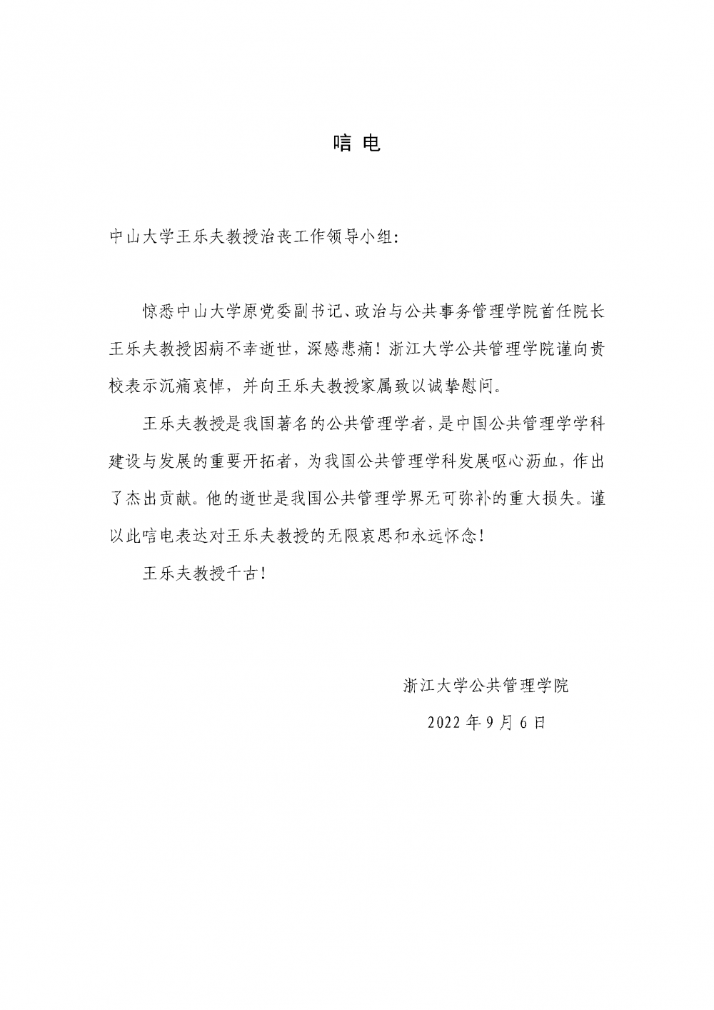 浙江大学公共管理学院唁电