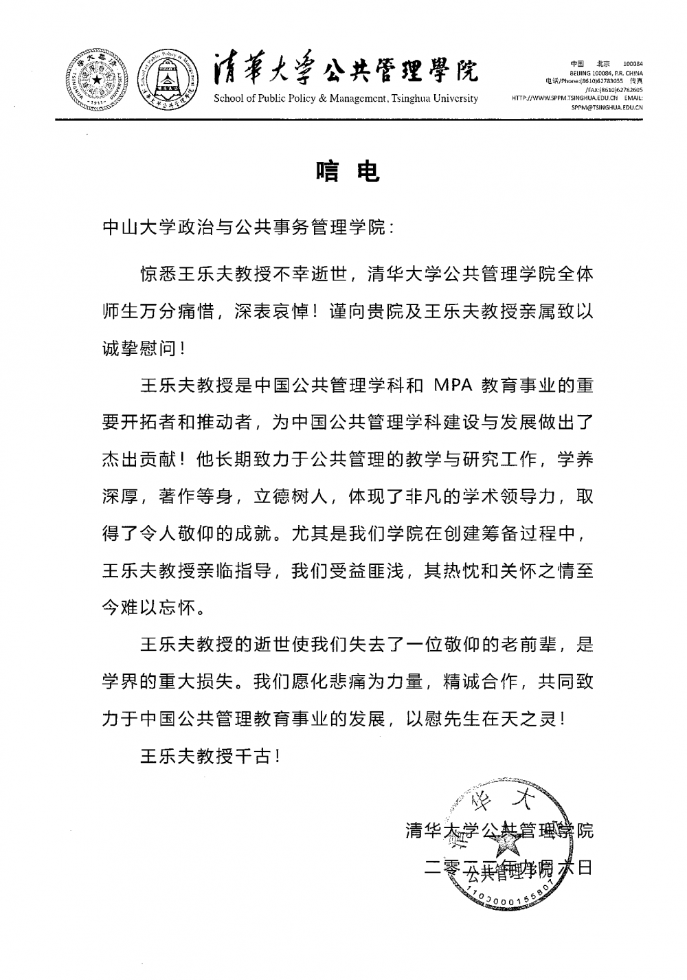 清华大学公共管理学院唁电