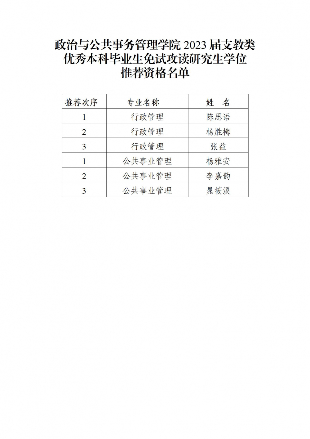 政治与公共事务管理学院关于公示2023届支教类本科毕业生免试攻读研究生学位推荐资格名单的通知