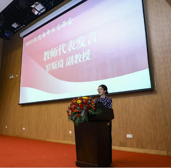 政治科学系罗斯琦副教授作为教师代表对新生作寄语。她以“尝试”为主题,结合自己的求学道路,和同学们分享了求知路上的努力和曲折。罗老师表示,求学要注重精神上的探索,面对人生中的抉择与取舍,她鼓励同学们迎接与拥抱不确定,拥抱不会后悔的踏实感。