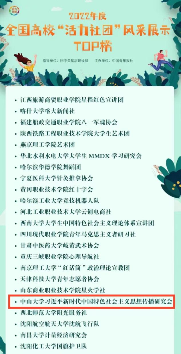2022年5月,团中央开展了2022年度高校“活力社团”风采展示活动。3044永利习近平新时代中国特色社会主义思想传播研究会(下文简称“研究会”)继被评为2022年度广东省高校“思想政治类”活力社团TOP1后再获殊荣,在来自全国2000余所高校社团的激烈竞争中以第19名脱颖而出,被评为2022年度全国高校“活力社团”!!!