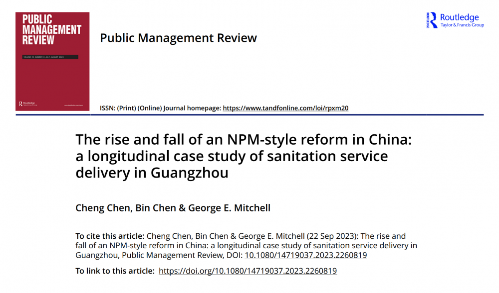 政务学院陈琤副教授与美国纽约市立大学-巴鲁克学院陈斌教授和George E. Mitchell教授合作的论文“The rise and fall of an NPM-style reform in China: a longitudinal case study of sanitation service delivery in Guangzhou”,近日于公共管理学国际权威期刊Public Management Review发表。