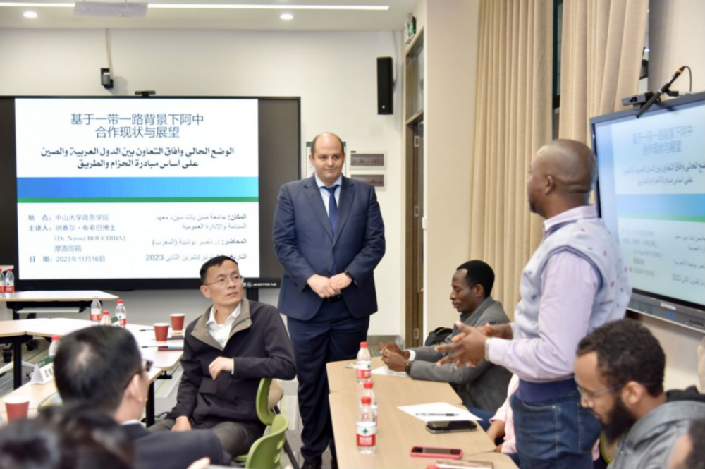 纳赛尔博士从中国90年代“引进来”与“走出去”战略讲起,梳理了中国推动共建“一带一路”的深厚背景,阐述了摩洛哥在二战后的国家建设路径,并将两国发展之路作了联系与分析,对中国一直以来的独立自主的和平外交政策、“绿水青山就是金山银山”的环保理念、分享科技成果的宽广胸怀表示赞赏。他结合在两国的生活经验,以生动的图片和视频为大家讲解文化共融的经贸合作新模式,向大家展示了摩中合作的历史渊源、“一带一路”背景下摩中合作的代表成果。讲座中,纳赛尔博士与同学们深入互动,现场气氛热烈。