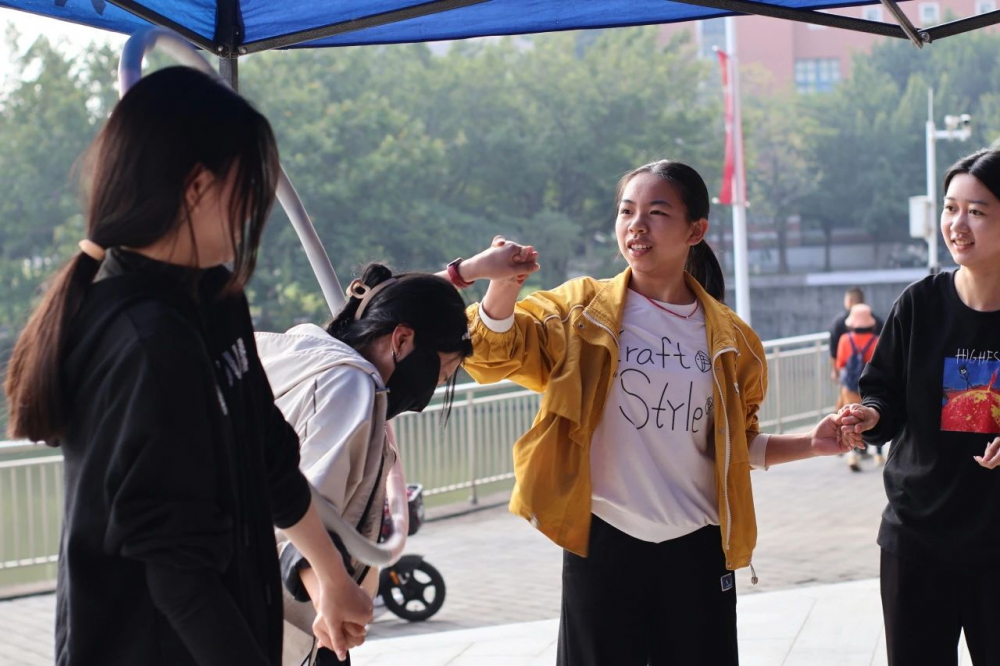 进入狗熊岭看见密布的丛林(指压板),“看来蹚过这片地方不容易呀!”在政务学院院楼门前,队员们玩起了“你划我猜”游戏。第一位队员根据工作人员给出的提示词,向后一位队员做出相应的动作,后一位队员模仿动作,直到最后一位队员猜出成语,让队友心领神会。欢声笑语中,各个队伍终于踏过了指压板,穿越了狗熊岭,走向下一关。