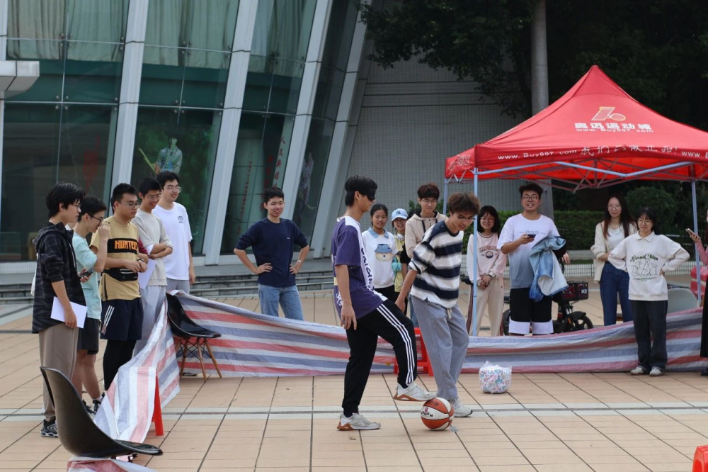 最后一站,参赛队伍来到了新闻传播学院门前的空地,这里是沙漠通往古国皇宫的必经之路。无数次拯救生灵的九色鹿深陷包围,这一次换我们来守护它!小伙伴们派出先锋战士,一人指挥方向,一人蒙眼踢球,朝着指定的灰色方框进发。唯有信任与默契,才能帮助团队一击即中、化险为夷,将九色鹿解救于危难之中。
