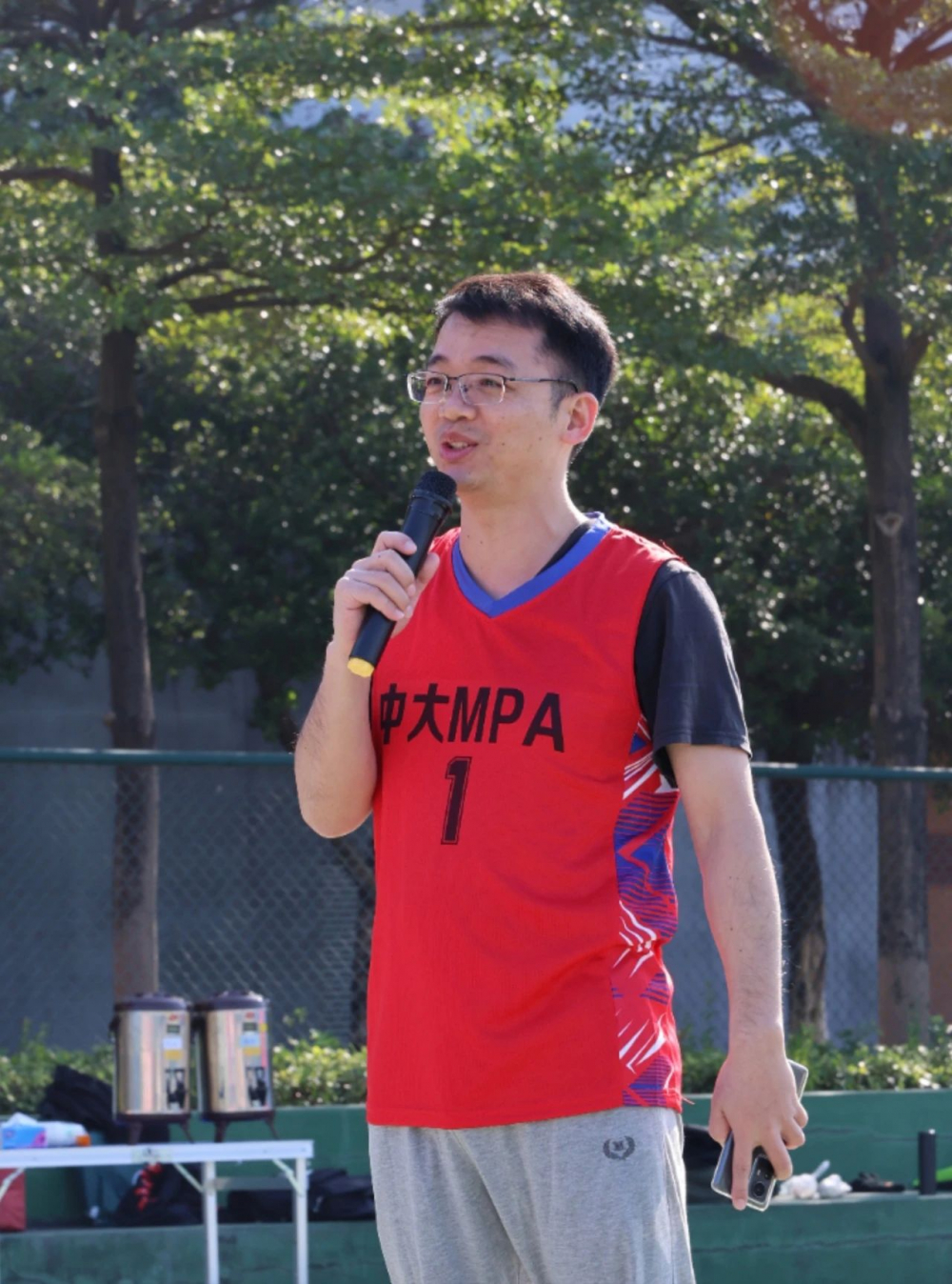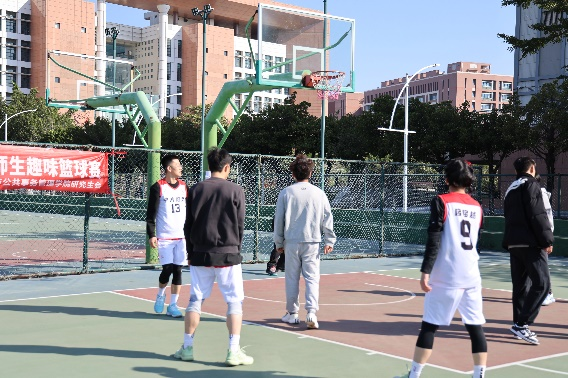 比赛开始前,参赛师生稍作热身。随后,政务学院工会主席谭英耀老师以及政务学院篮球队队长练宏老师进行致辞,鼓励广大师生积极参与体育活动,以健康的体魄迎接生活。