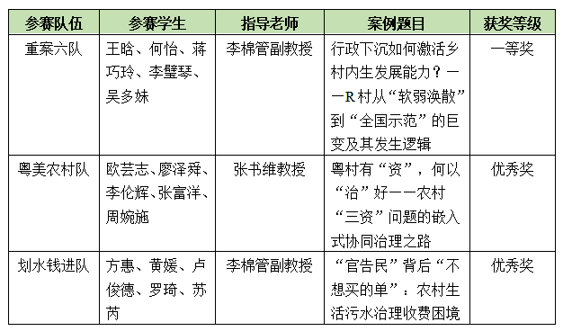 此外,在初赛的两轮匿名评审中,政务学院“粤美农村队”(指导老师:张书维教授,队员:欧芸志、廖泽舜、李伦辉、张富洋、周婉施)和“划水钱进队”(指导老师:李棉管副教授,队员:方惠、黄媛、卢俊德、罗琦、苏芮)入围前20%案例,荣获优秀奖。