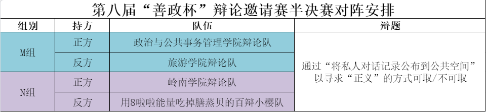 半决赛将于本周六(3月30日)进行,辩题为“将私人对话记录公布到公共空间”以寻求“正义”的方式可取/不可取。期待半决赛中各支队伍更加精彩的表现!
