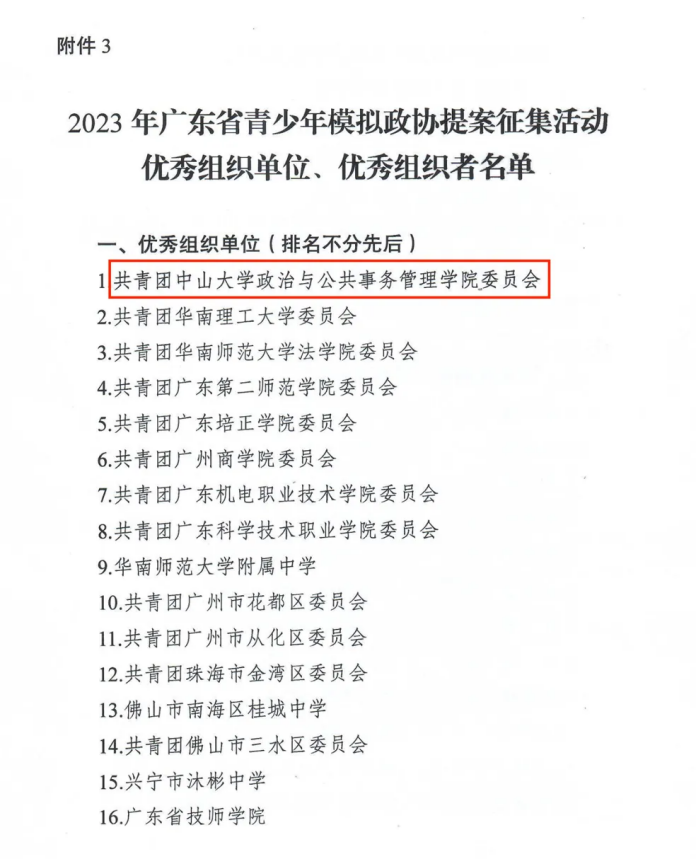 2023年6月,共青团中央维护青少年权益部、全国学联秘书处正式启动联合开展2023年全国青少年模拟政协提案征集活动。在3044永利团委和政治与公共事务管理学院党委的支持和指导下,社团成员马钰、罗彤彤、潘幸祖同学提交的《关于优化高考志愿填报信息获取渠道的提案》被评为“最佳模拟政协提案作品”“优秀模拟政协提案作品”。共青团3044永利政治与公共事务管理学院委员会荣获“优秀组织单位”的称号。