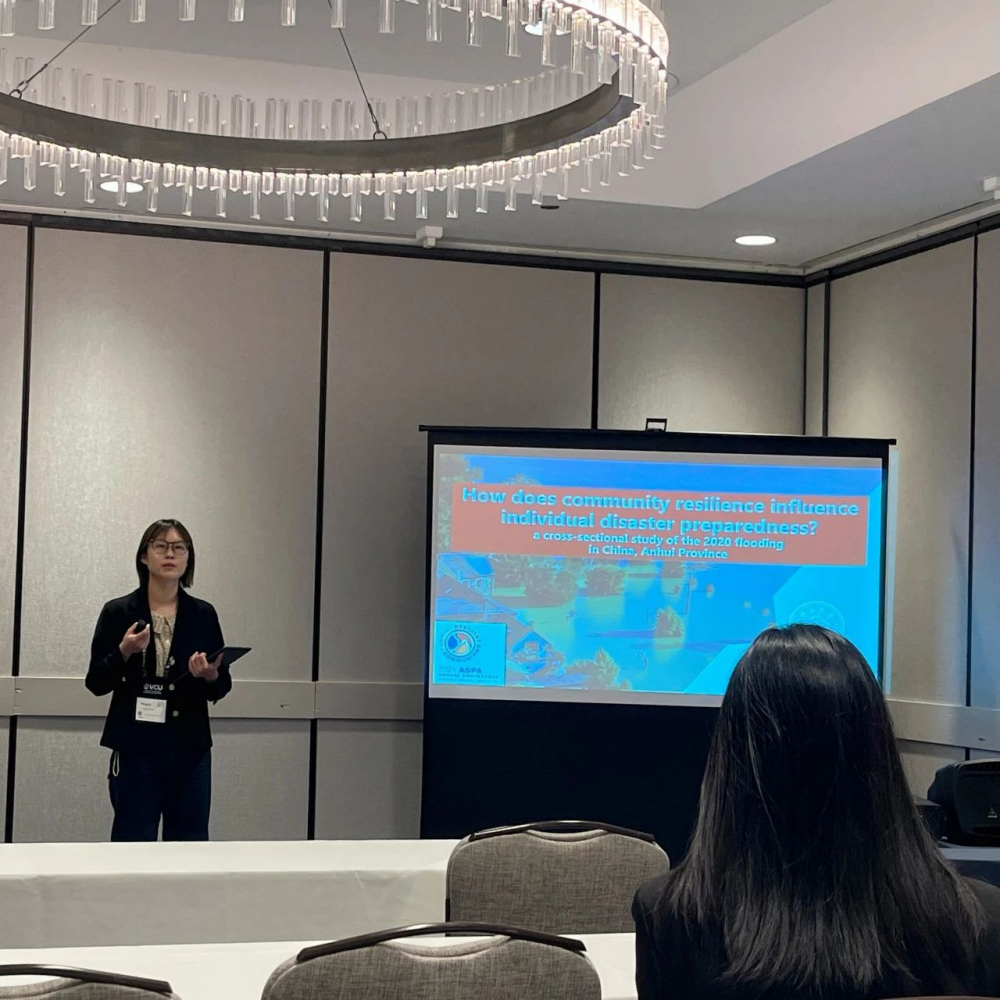在“Preparing for and Responding to Disasters: From Households to Communities”主题议程中,庞明慧同学作《社区韧性如何影响个人灾害准备?》的研究报告。该研究基于2020年安徽省洪水的问卷调查数据,以心理资本和风险感知为心理机制,讨论了社区资源、风险沟通对洪灾区居民灾害准备行为的影响路径。在此基础上提出了构建社区灾害韧性提升公众灾害准备的政策建议。