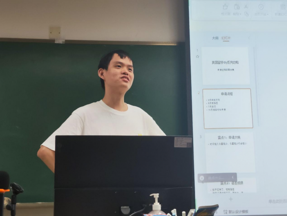 第三位分享的是2020级政行专业的李飞扬同学。李飞扬同学申请了伦敦政经学院、爱丁堡大学的国际关系专业,香港大学中国发展研究专业和曼彻斯特大学的政治学专业,并最终选择了曼彻斯特大学的政治学专业。他以自己留学前的学习情况作为开头,倾情分享如何在绩点不占优势的情况下申请国外高校,此外重点介绍了雅思的学习经验,英国留学的三个申请雷点和文书DIY撰写的经验,建议准备留学的同学们早准备早申请。