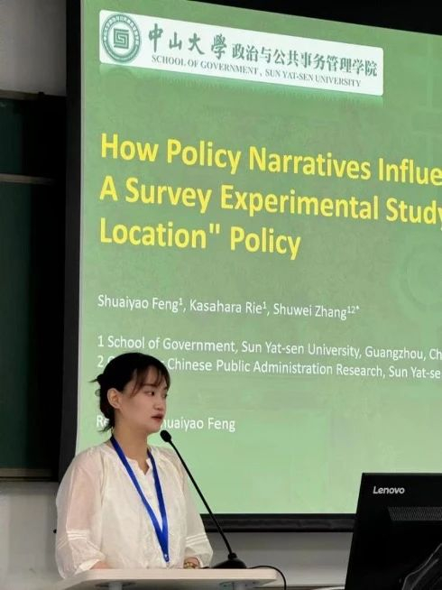 2023级博士生冯帅瑶在平行分论坛2-A(Digitalization and Public Policy )上报告了论文“How Policy Narratives Influence Policy Support: a A Survey Experimental Study Based on the ‘Display of IP Location’ Policy”(Shuaiyao Feng, Kasahara Rie, Shuwei Zhang*)。该研究使用调查实验法分析政策叙事如何影响公众政策支持度,研究结果验证了政策叙事影响公众政策支持度的两条因果机制路径,并据此提出了政策过程中如何进行政策叙事构建的相关政策建议。