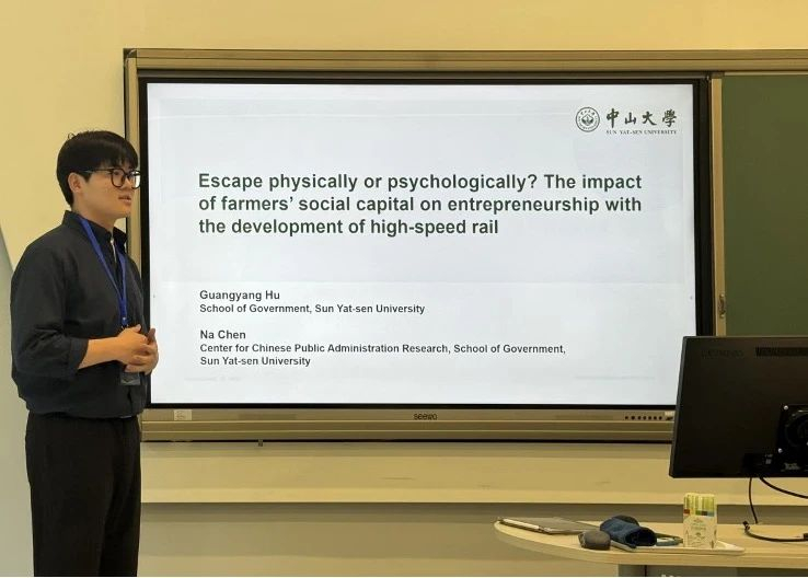 2023级硕士生胡广洋在“E-commerce, Transportation and Rural Revitalization”主题议程中,作《身或心的逃离?高铁发展背景下社会资本对农民创业的影响》的研究报告。该研究基于CHIP2018的农村数据,讨论了高铁不断发展背景之下,农户的社会资本对其创业行为的影响作用。在此基础上提出了改善农户生计策略、推动乡村振兴的政策建议。