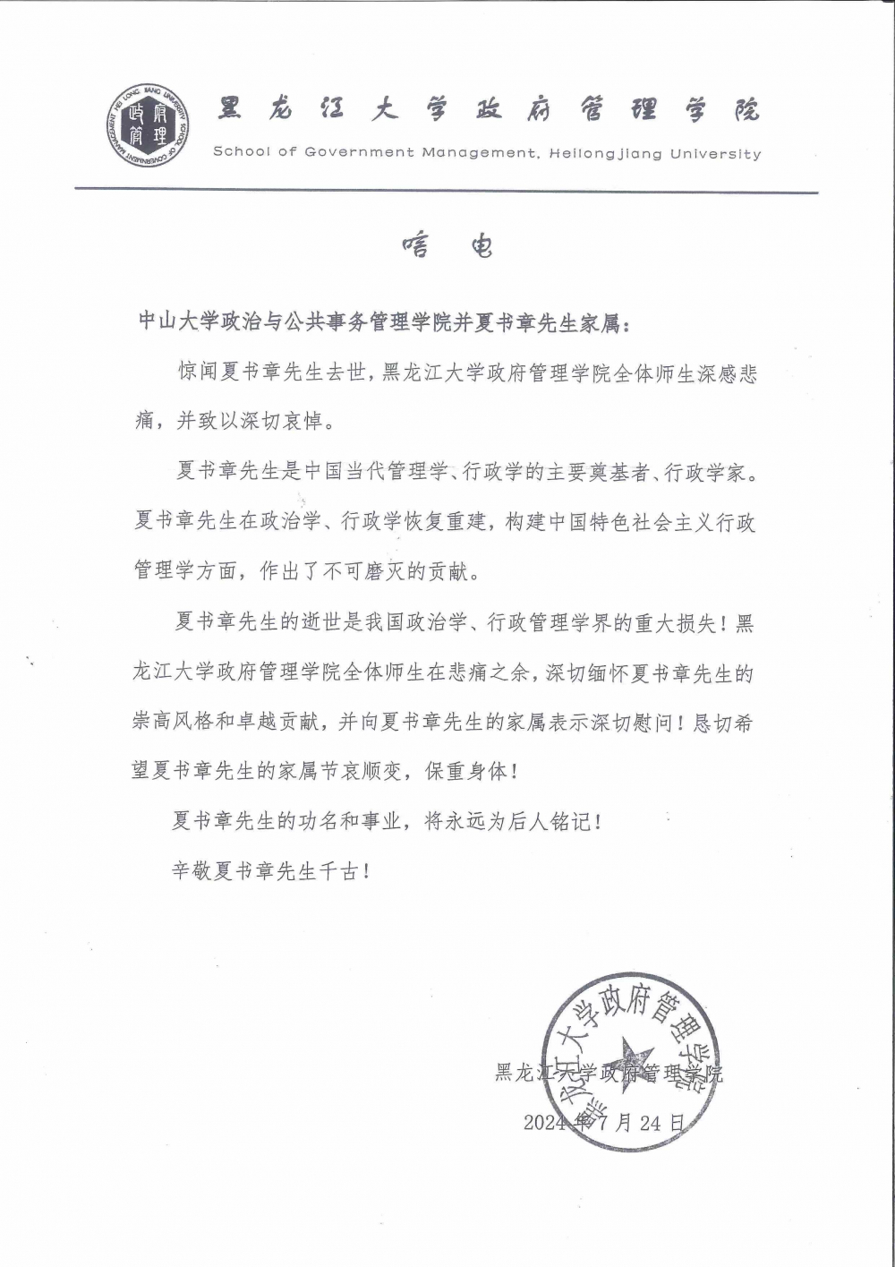 黑龙江大学政府管理学院唁电