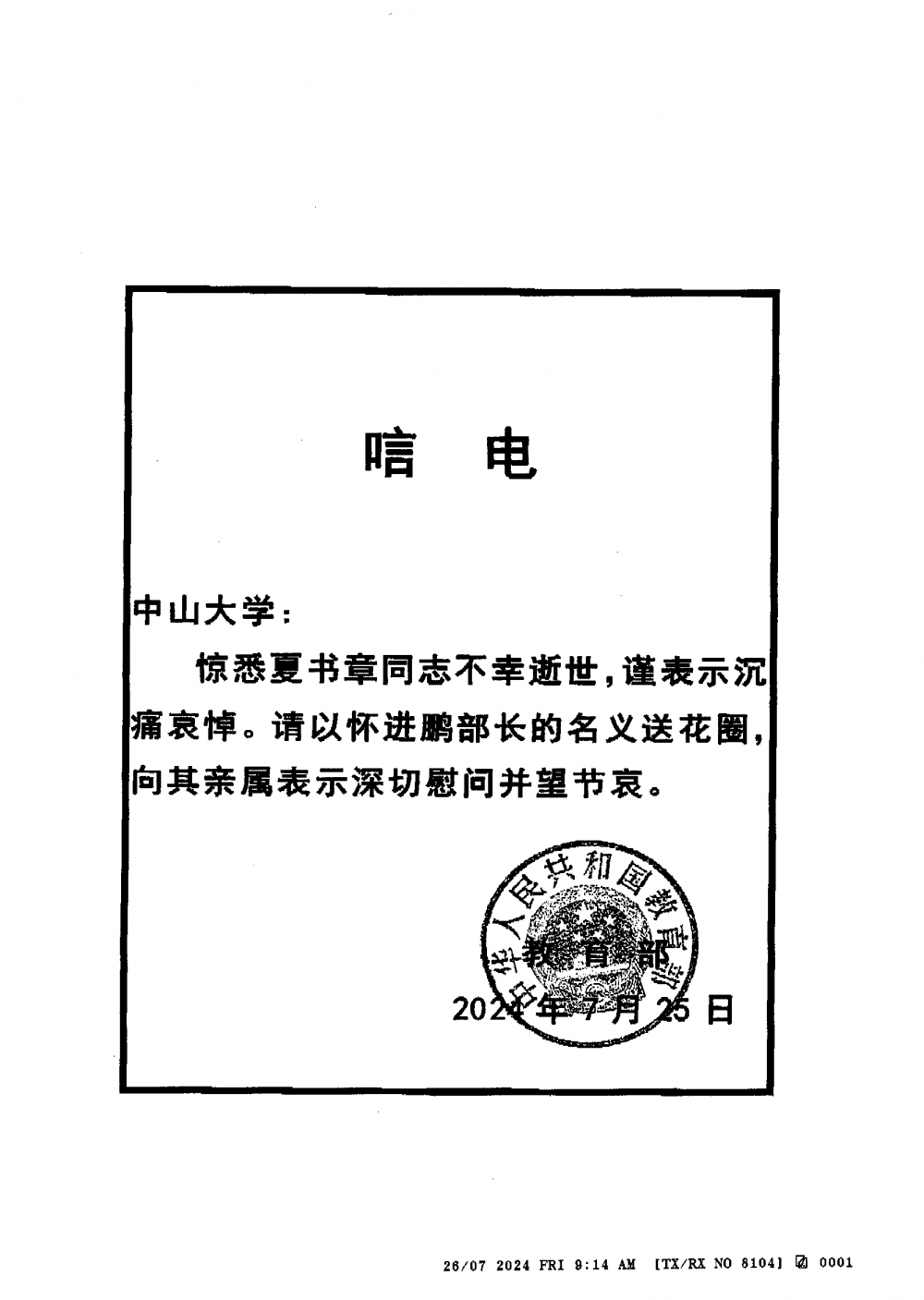 中华人民共和国教育部唁电