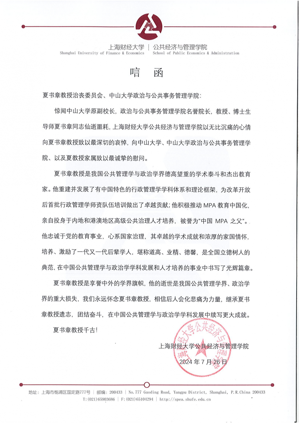 上海财经大学公共经济与管理学院唁电