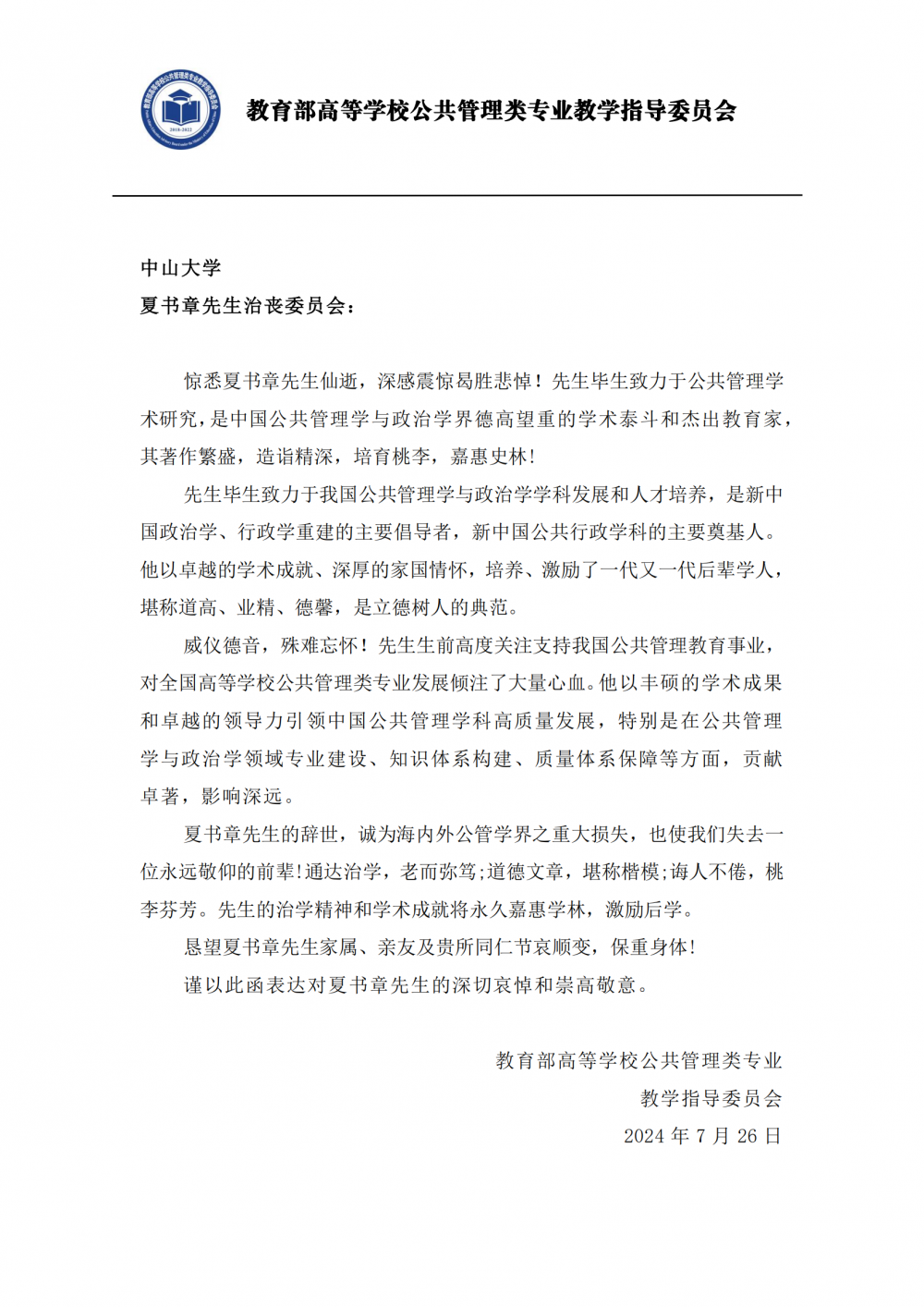 教育部高等学校公共管理类专业教学指导委员会唁电