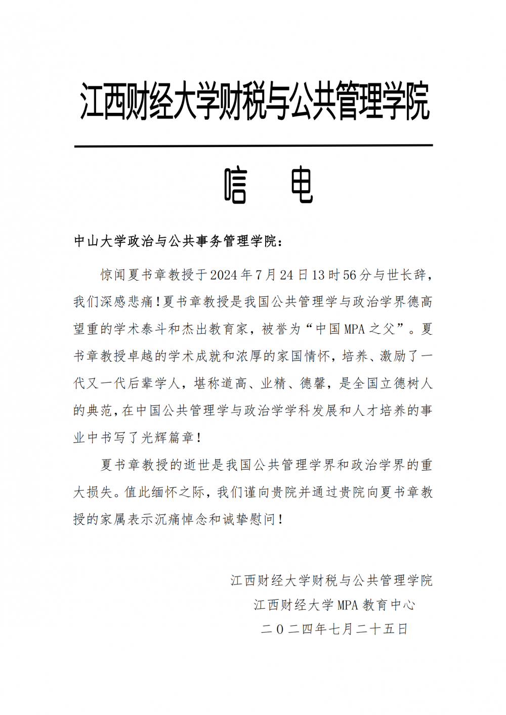江西财经大学财税与公共管理学院、江西财经大学MPA教育中心唁电