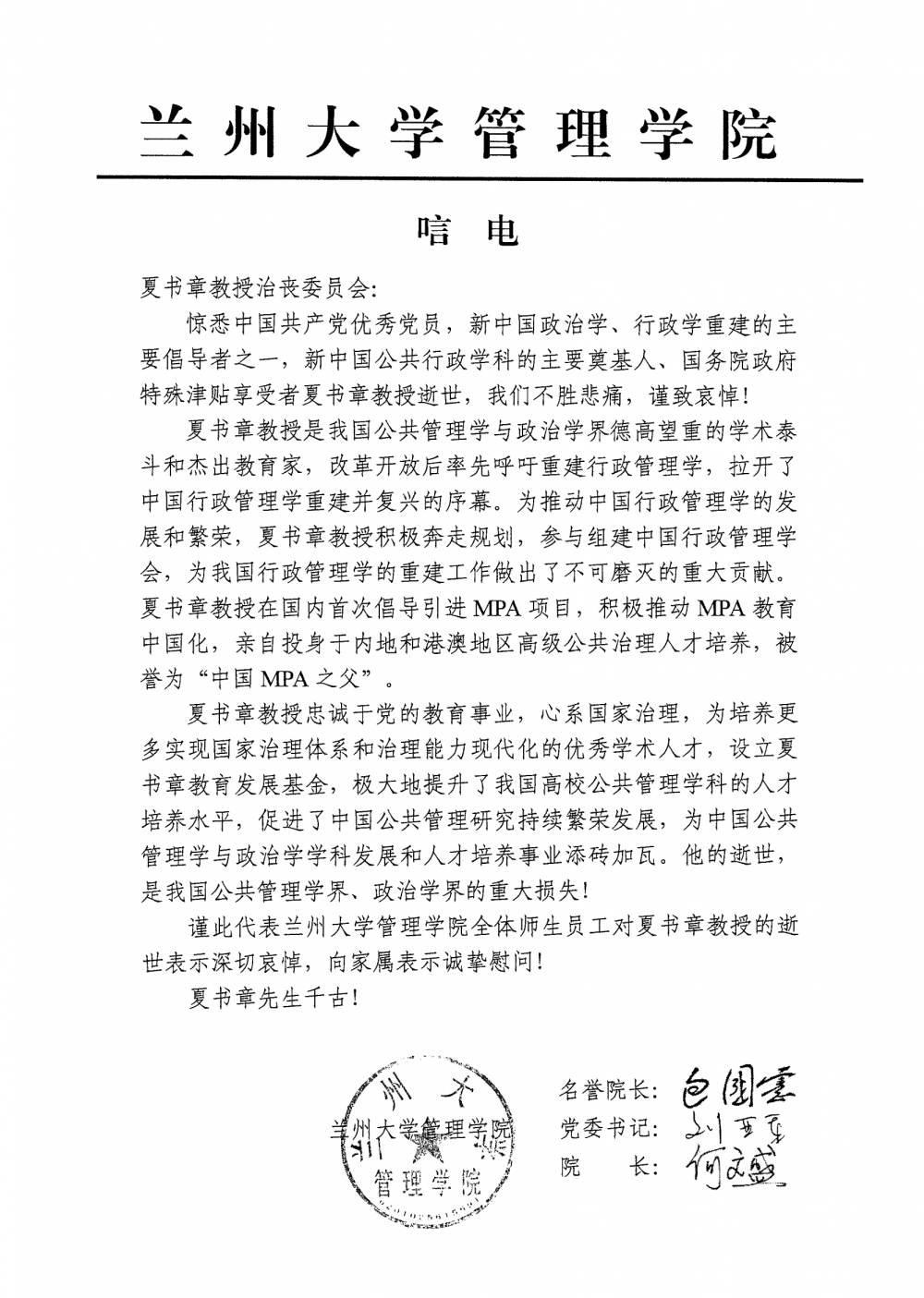 兰州大学管理学院唁电