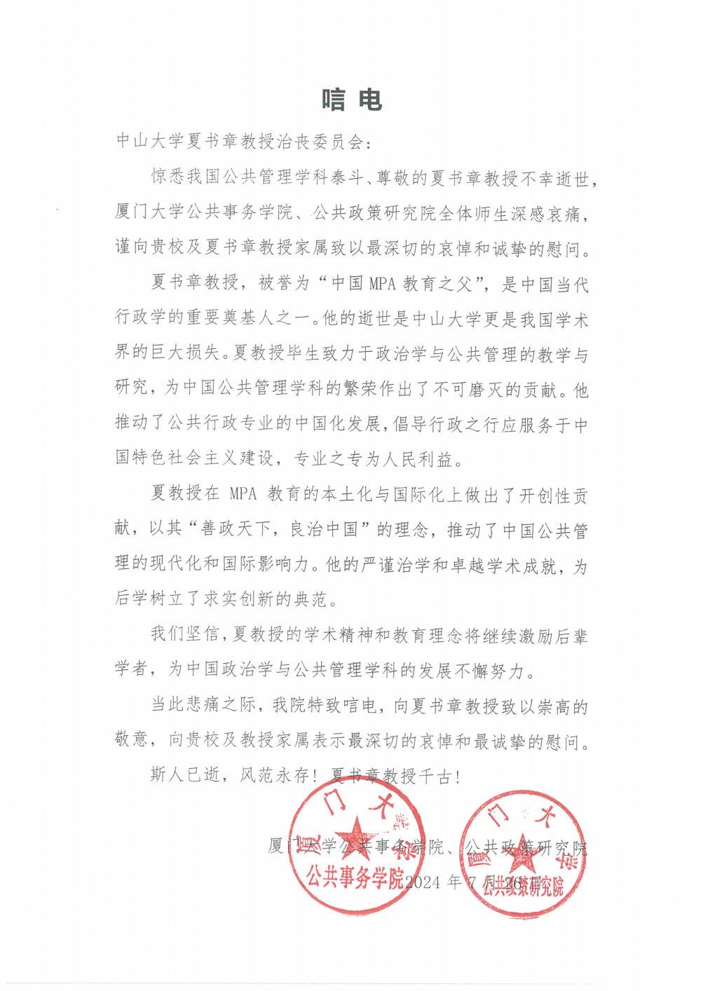 厦门大学公共事务学院、公共政策研究院唁电