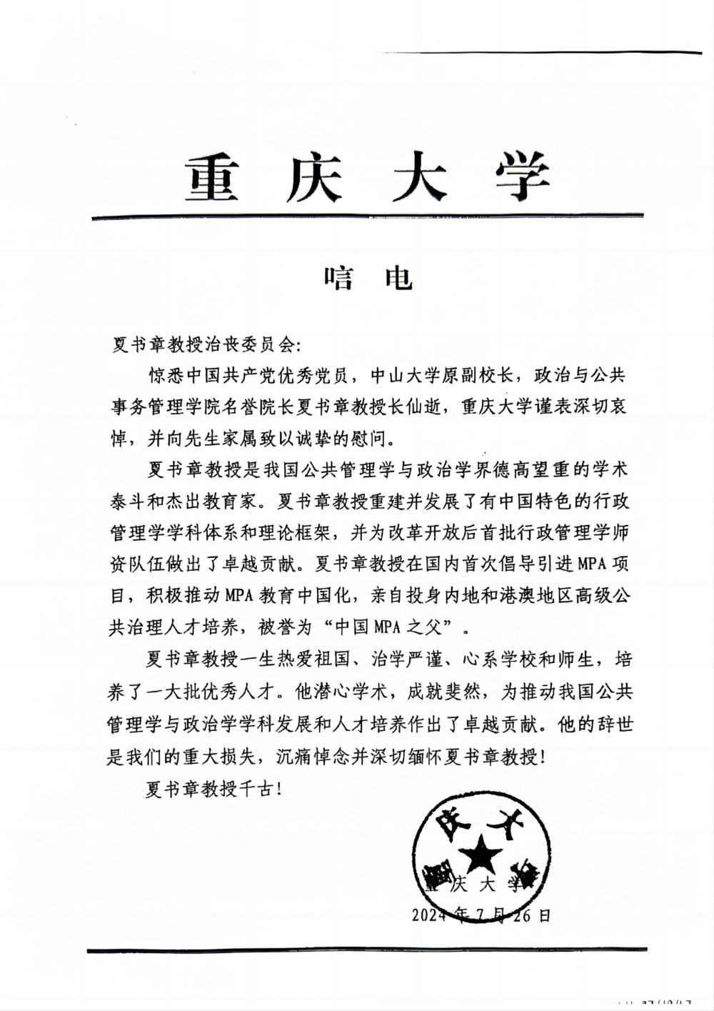重庆大学唁电