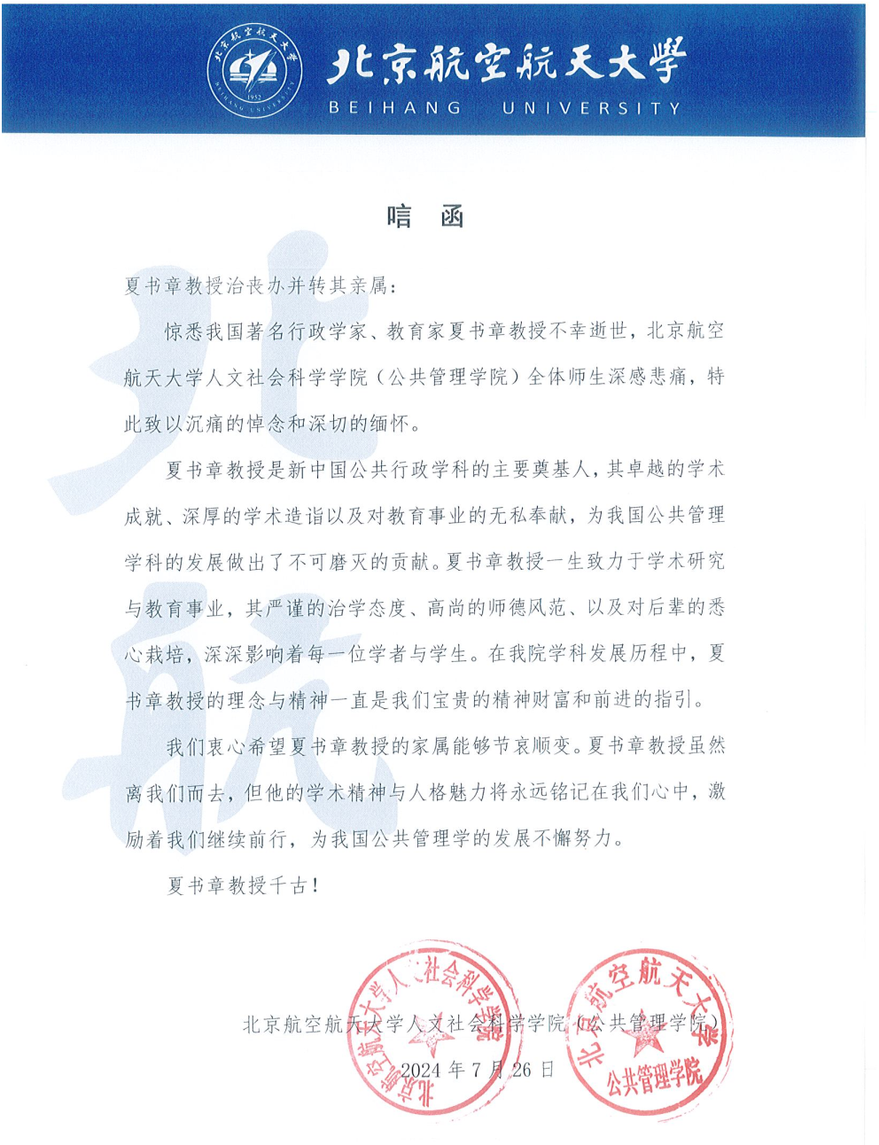 北京航空航天大学人文社会科学学院(公共管理学院)唁电