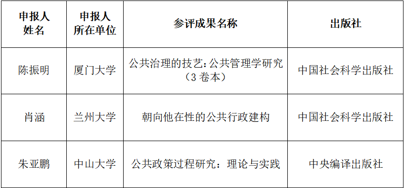 第一届“夏书章学术奖”评选工作自2025年10月启动以来,得到了全国公共管理学界的广泛关注和大力支持。第一届“夏书章学术奖”组织委员会(以下简称“组委会”)严格按照《第一届“夏书章学术奖”评奖公告》公布的评选程序,认真、细致地组织了形式审查、现场初评和匿名通讯评审,现已遴选出第一届“夏书章学术奖”优秀学术著作奖候选成果3项、第一届“夏书章学术奖”优秀学术论文奖候选成果5项及第一届“夏书章学术奖”优秀博士论文奖入围现场终评论文10篇,现将名单公示如下: